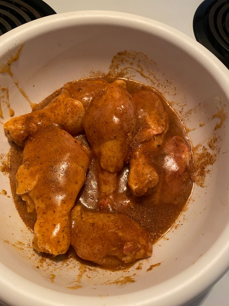 I started off with dumping the chicken in a bowl with this marinade & some Ragin Cajun dry rub seasoning.